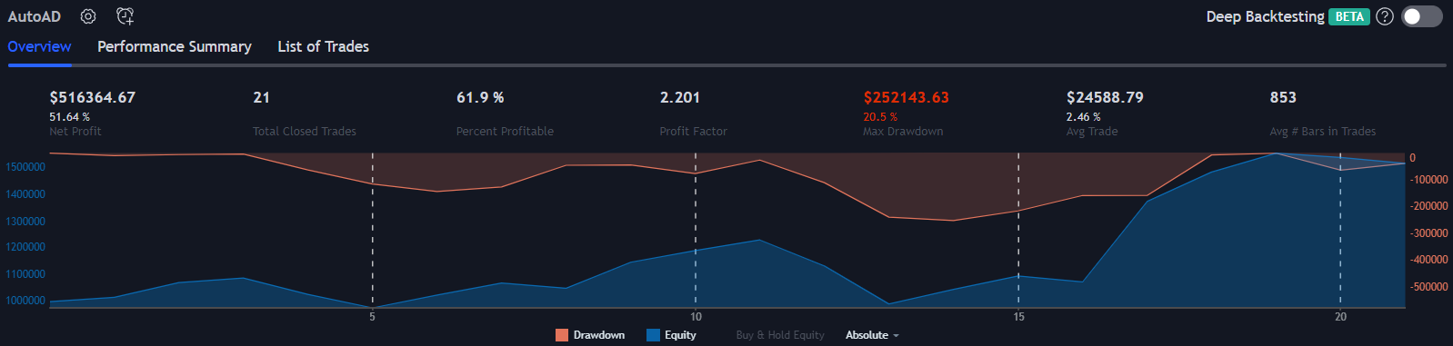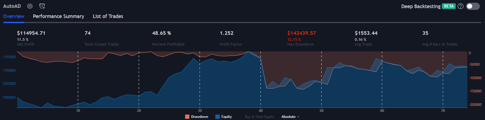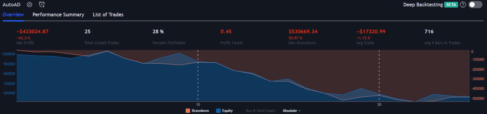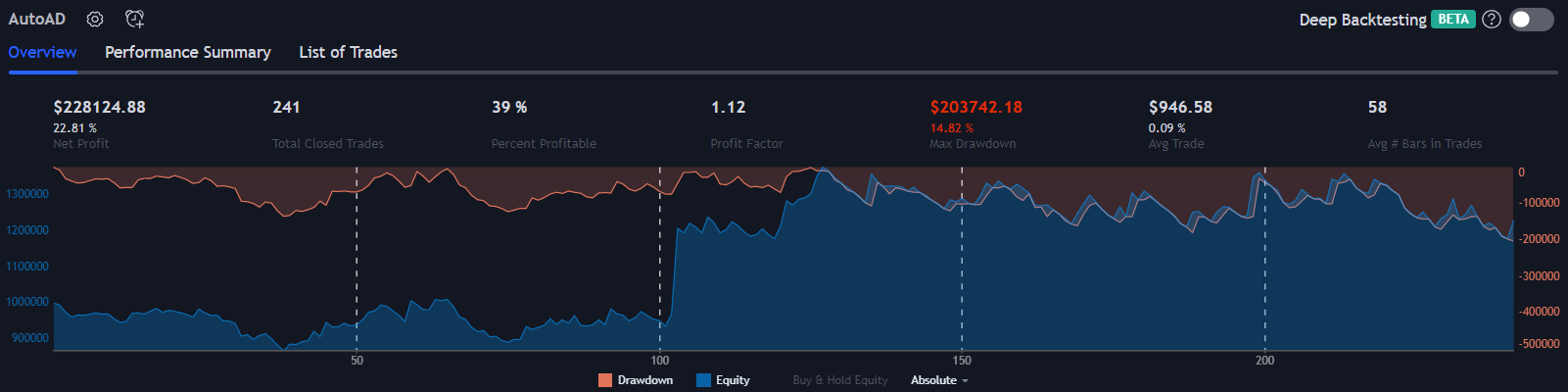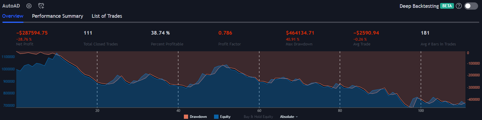 All results on this page are using the default strategy conditions which come with AutoAD. Those conditions are: