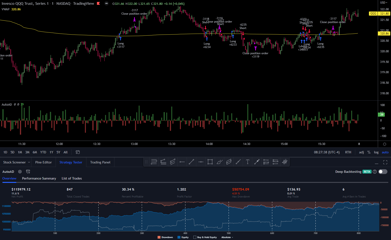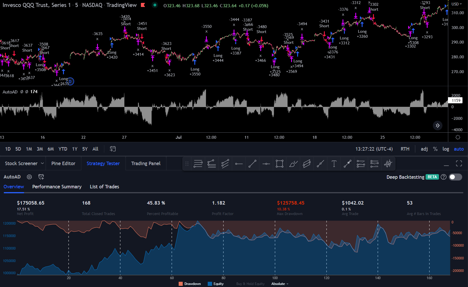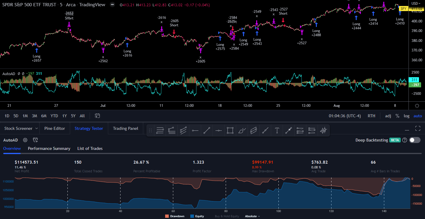 This strategy uses the Weighted NDX AD for it’s entries and will close 10 candlesticks after the most recent entry. In these examples it will be ran on the 1m timeframe over the last three months or so. Because it’s using the NDX preset, it’s suggested to apply this strategy to constituents of the NDX or assets which are highly correlated with the NDX.