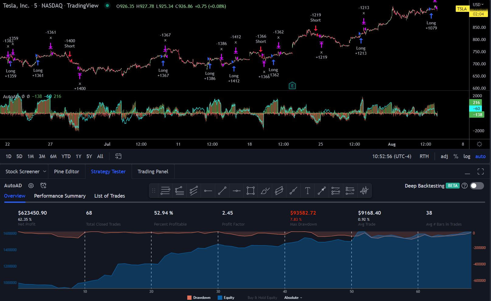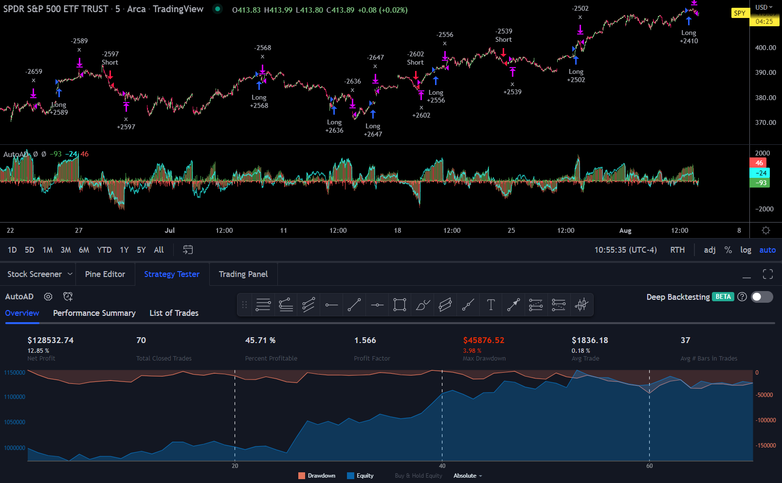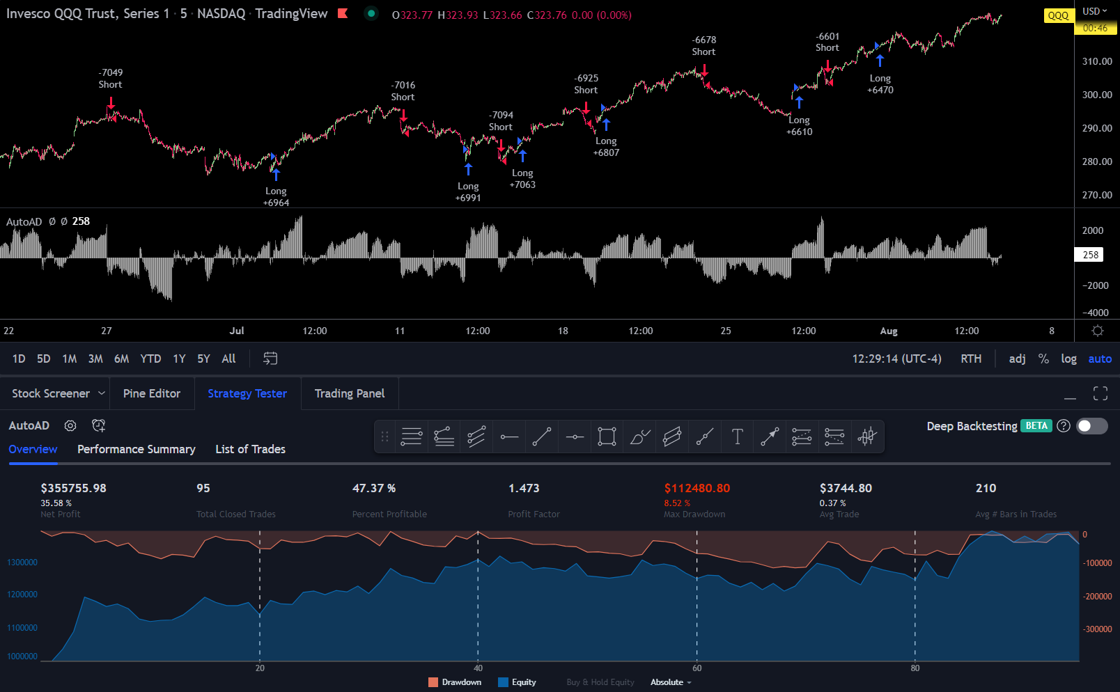 This strategy uses the Weighted NDX AD for it’s entries and will close 10 candlesticks after the most recent entry. In these examples it will be ran on the 1m timeframe over the last three months or so. Because it’s using the NDX preset, it’s suggested to apply this strategy to constituents of the NDX or assets which are highly correlated with the NDX.