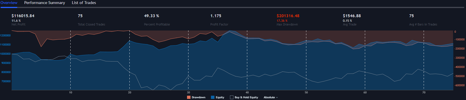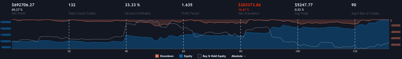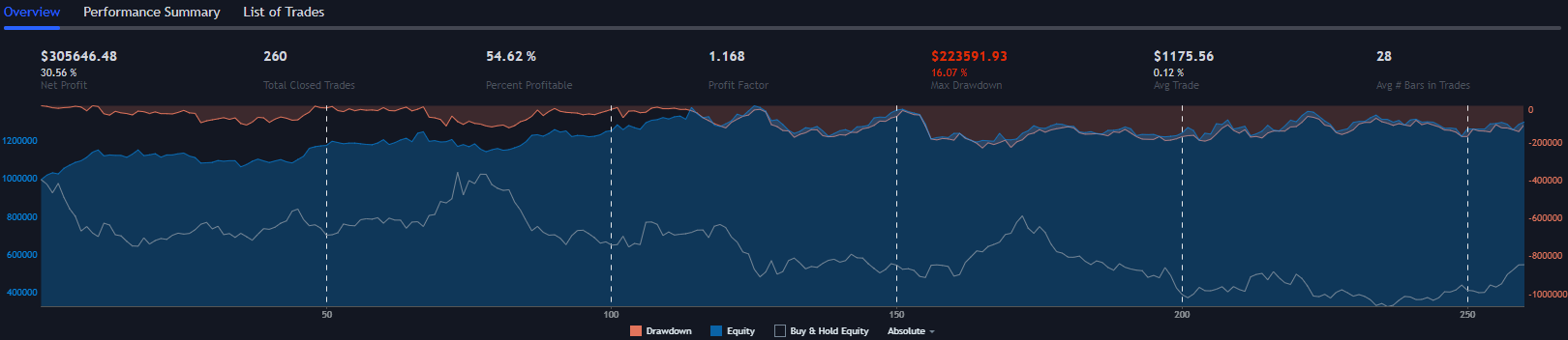 Every trade uses $1,000,000. It will never be more or less than this until the account balance reaches 0. Using a flat nominal number gives reliable results and is more easily understood when looking at the profit factor and average trade percent statistics. This is to avoid compounding and unrealistic results. It’s okay to use a percentage of your account size so long as the percent used is low. What “low” means will depend on the volatility of the symbol you’re trading.