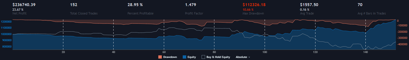 There is technically one exit trade conditions, however, the entry trade conditions cannot be true if the strategy is going to exit out of a trade. So, in reality, there are four exit trade conditions. They are the inverse of the conditions above. Basically, the first three conditions cannot be true and the chart must be below i't’s midpoint to exit out of a long trade. It must be above the midpoint to exit out of a long trade.