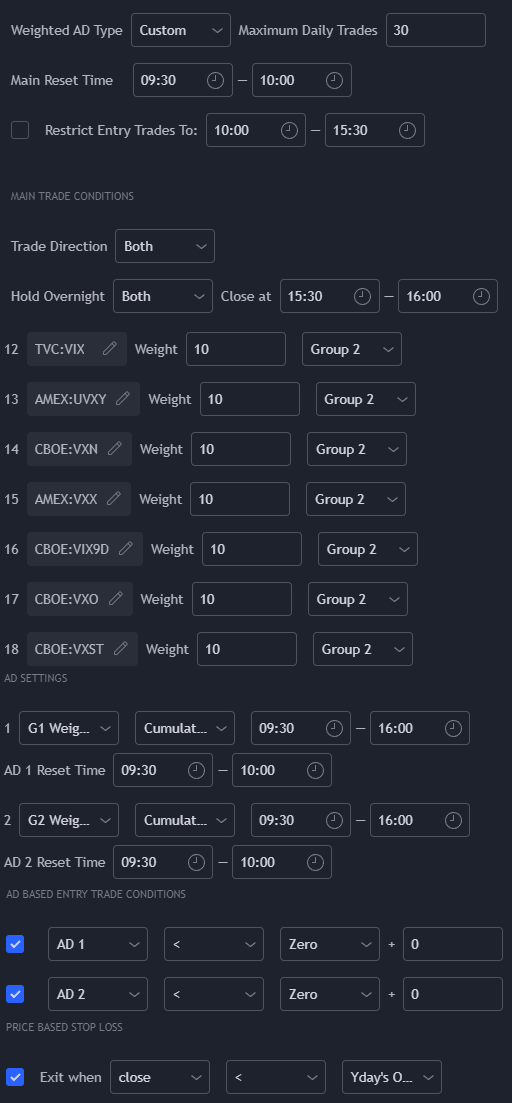Most of the settings used are default. Group 1 and AD 1 are assigned to the S&P subsectors. Group 2 and AD 2 are assigned to the volatility products as shown in the settings on the right.