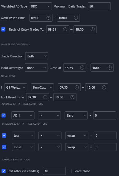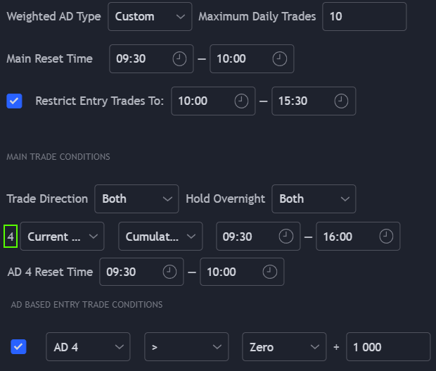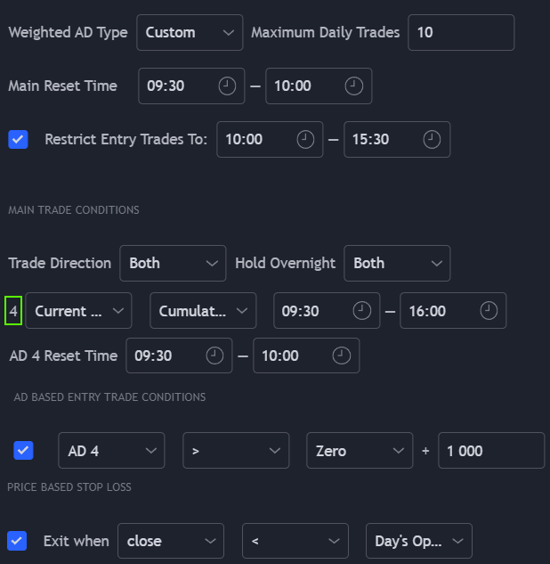 By using the ‘Custom’ choice from ‘Weighted AD Type’; AD 4 is set to the current chart, cumulative. There is only one trade condition used here - the chart’s AD must be greater than (or less than for shorts) 1000 (+/- 1% from the open).