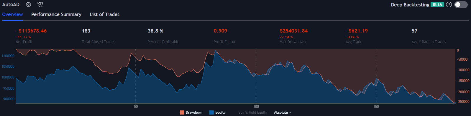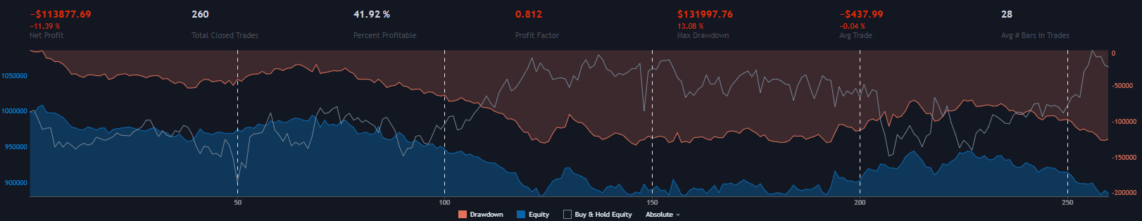 At first glance, this looks great. However, the 26% drawdown is a big red flag. It may seem easy to tolerate when compared with a 90% net profit, but if your strategy immediately lost 26%, wouldn’t it seem sensible to turn it off?