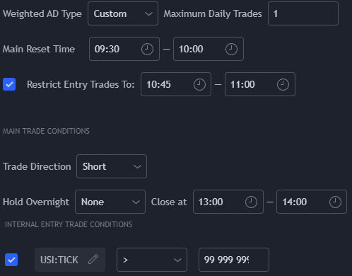 The only trade condition which this strategy uses is that TICK must be below an impossibly high number to enter into a trade. All of the other conditions come from the time restrictions placed on the strategy in the primary trade conditions at the top of the settings menu. All other conditions are disabled. No groups or ADs are used.