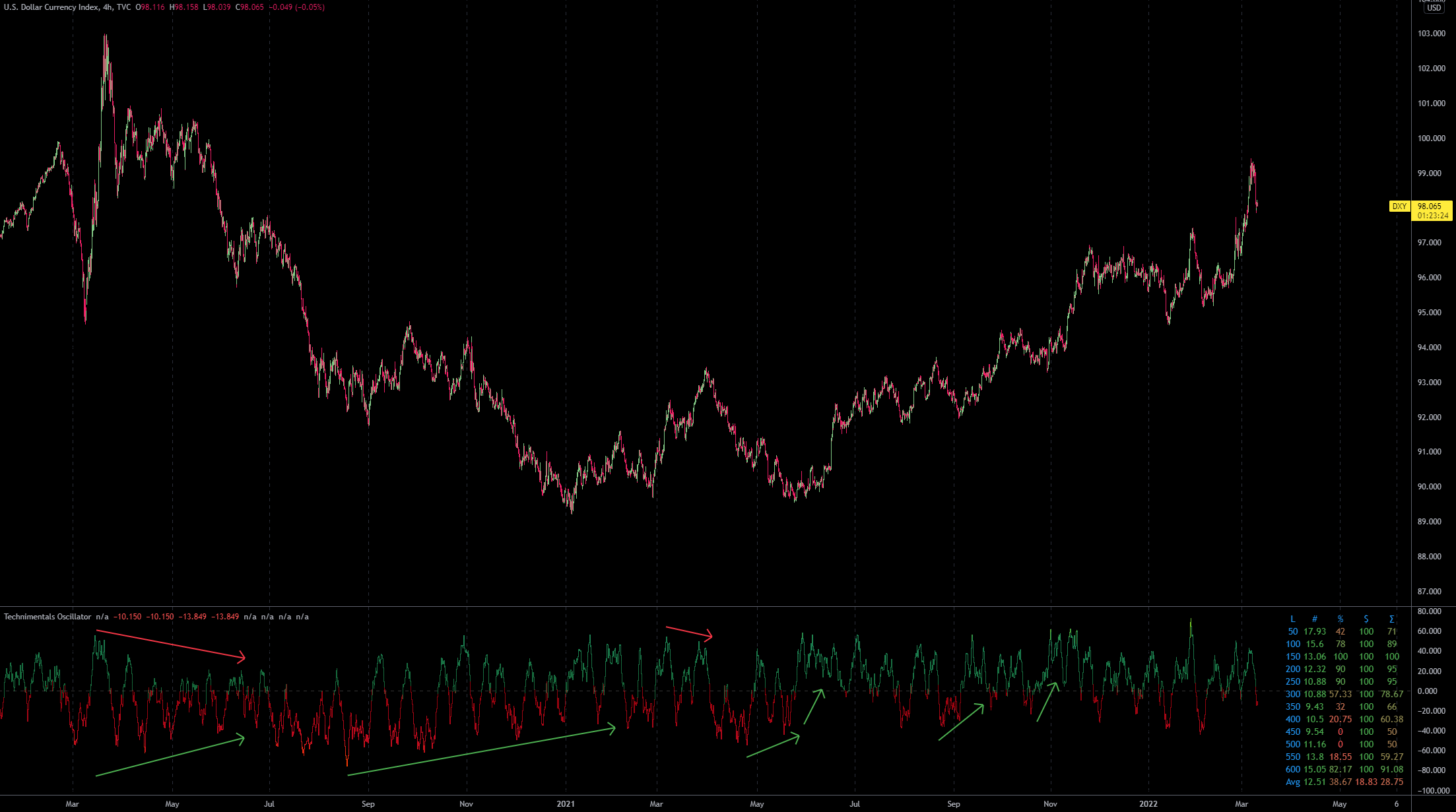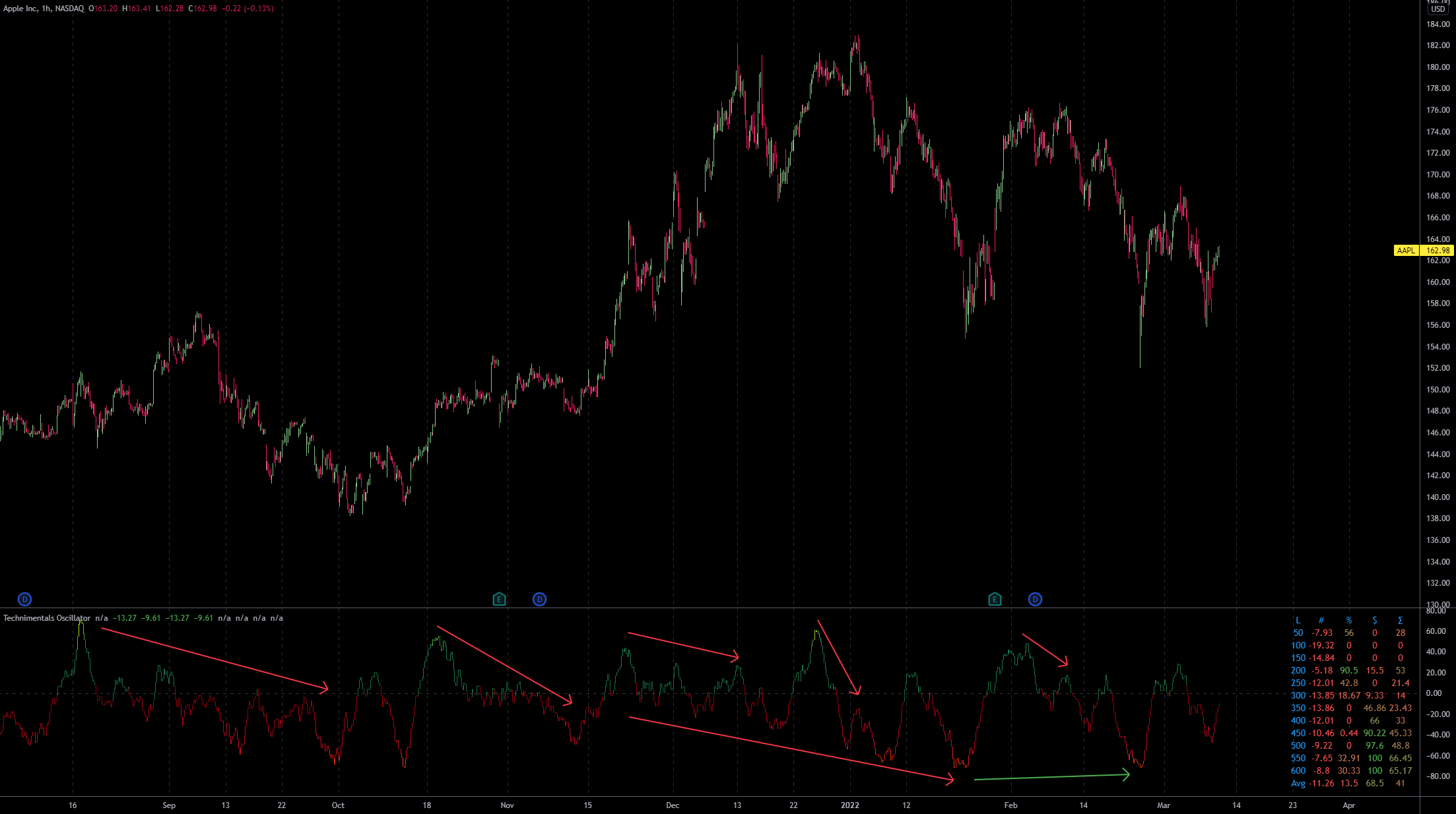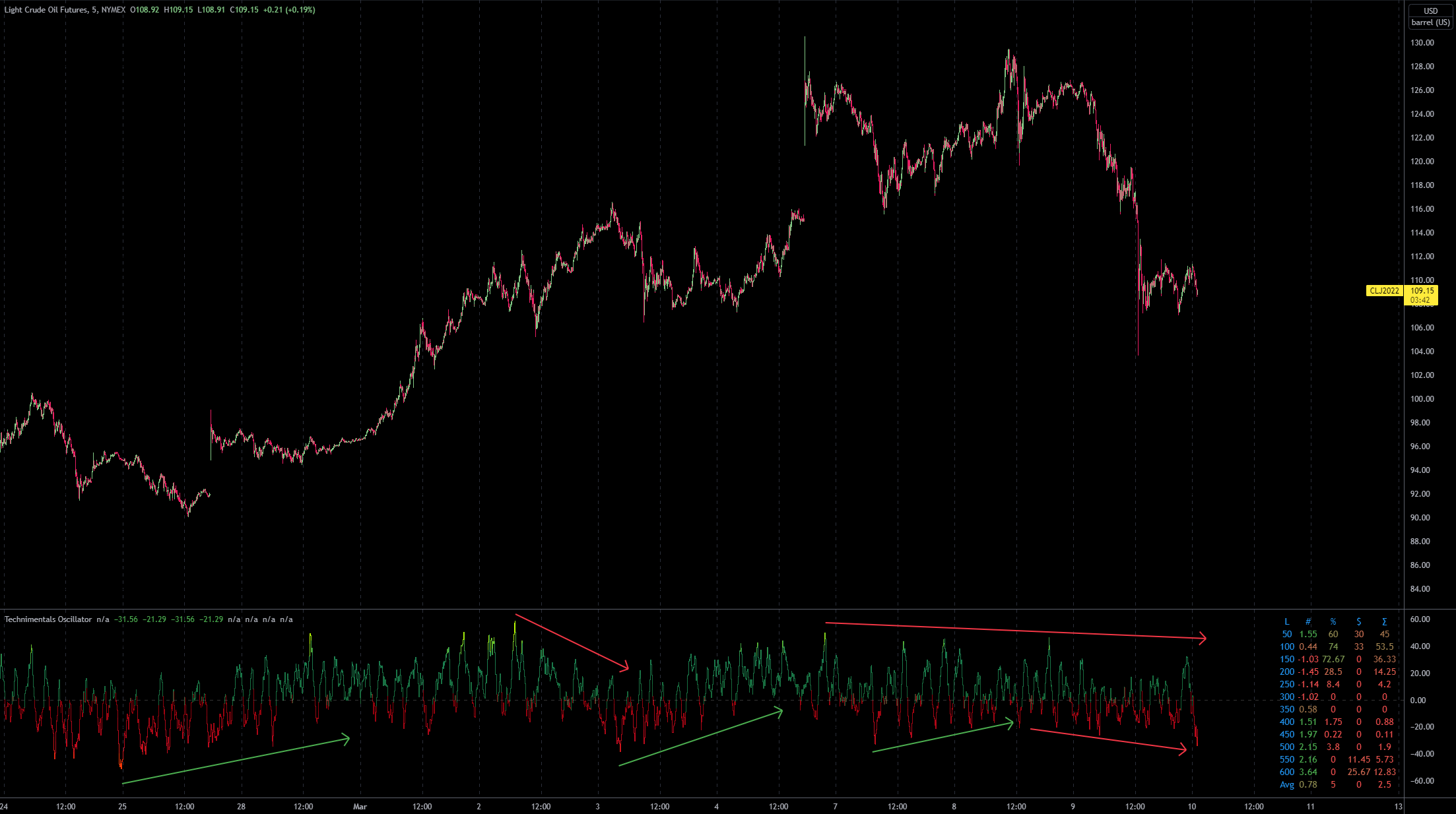 Multiple built-in quantified metrics of money flow including a table featuring the performance and divergence between the oscillator and price