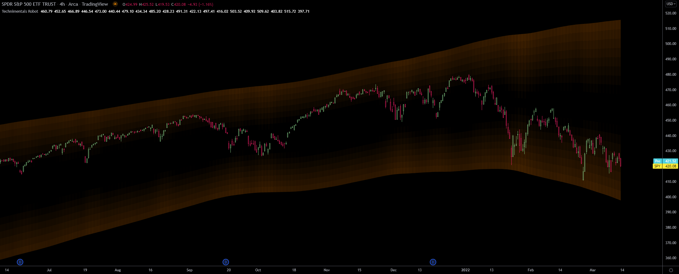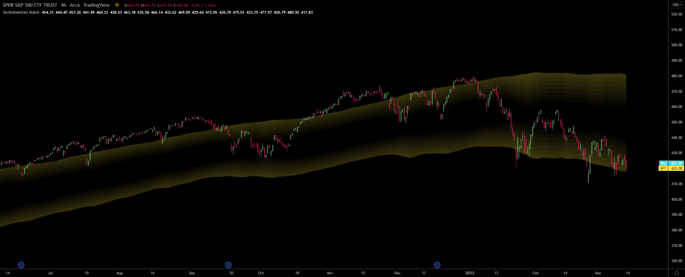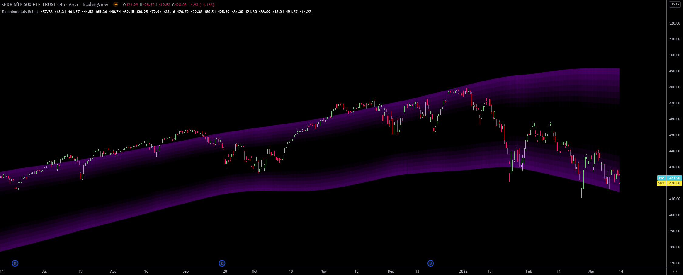 These bands are built by firstly using a volatility and short term range detection algorithm and plugging this into three different lengths of smoothing filters. The output is then combined and filtered one last time before being colored and plotted as multiple bands.